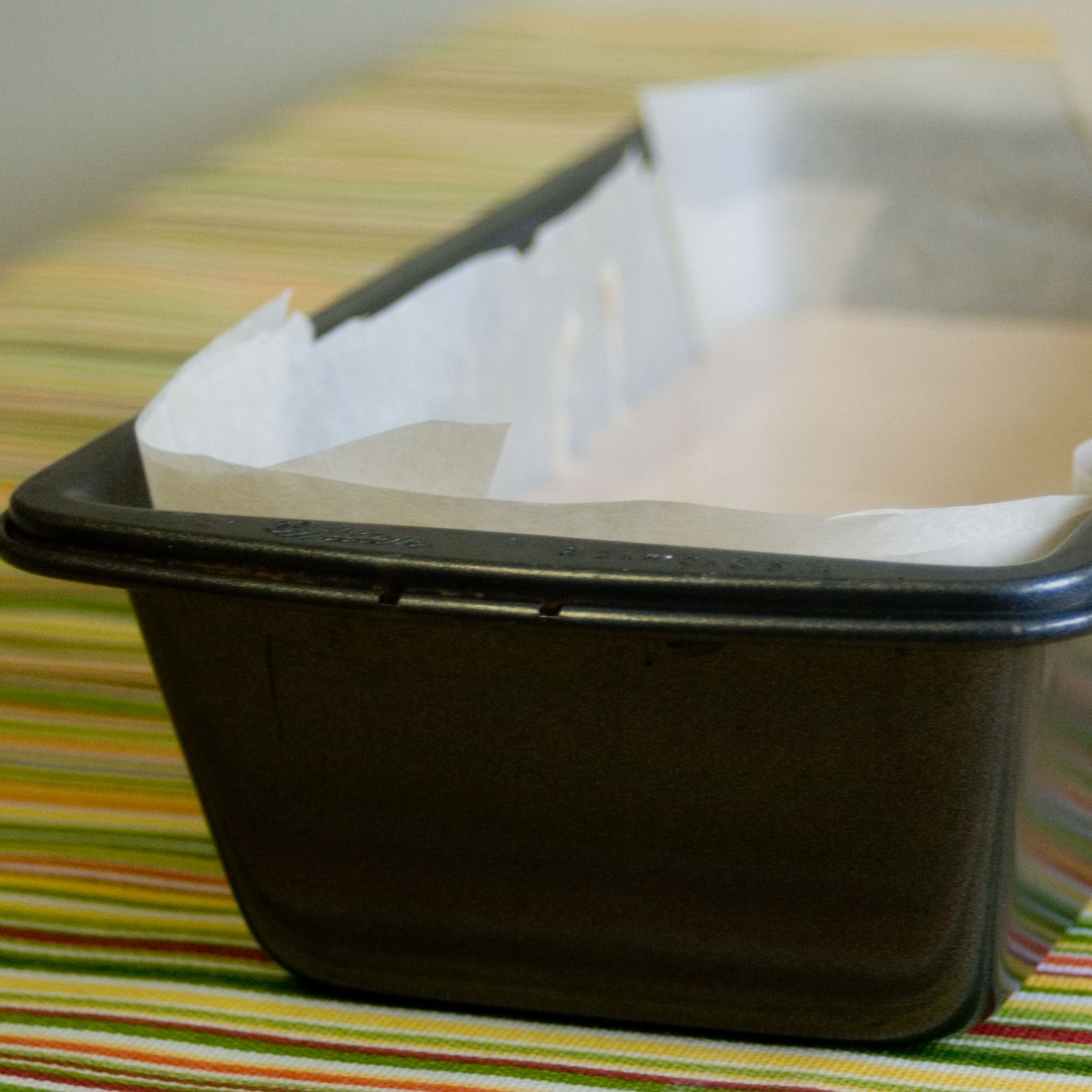 Line a loaf pan with parchment paper or lightly coat it in cooking spray and pour in the batter. Bake at 350 for 45 minutes.